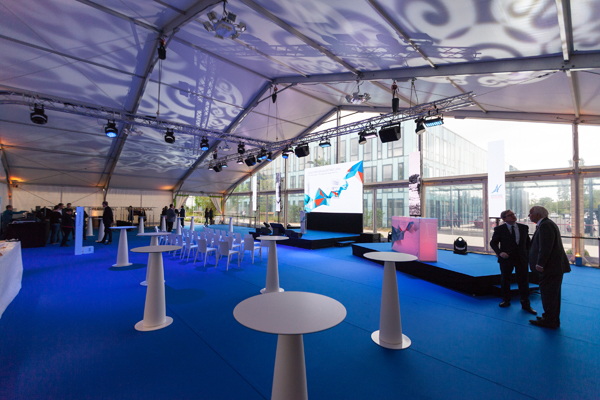 L’inauguration du nouveau siège social de 8500 m² des laboratoires Aguettant à Lyon a eu lieu à Lyon le 12 mai dernier en présence du Maire de Lyon, Gérard Collomb, ainsi que Laurent Wauquiez, président de la région Rhône-Alpes-Auvergne. Dans ce cadre là, l’agence Thera Conseil nous a confié le montage du chapiteau 30 m x 15 m avec une partie en bâche cristal, ainsi que son aménagement intérieur (moquette, pupitre, scènes, vestiaires, mange debout, chaise blanche, accessoires déco, et desk sur mesure). Le ciel était gris mais sous la tente, c’était superbe !