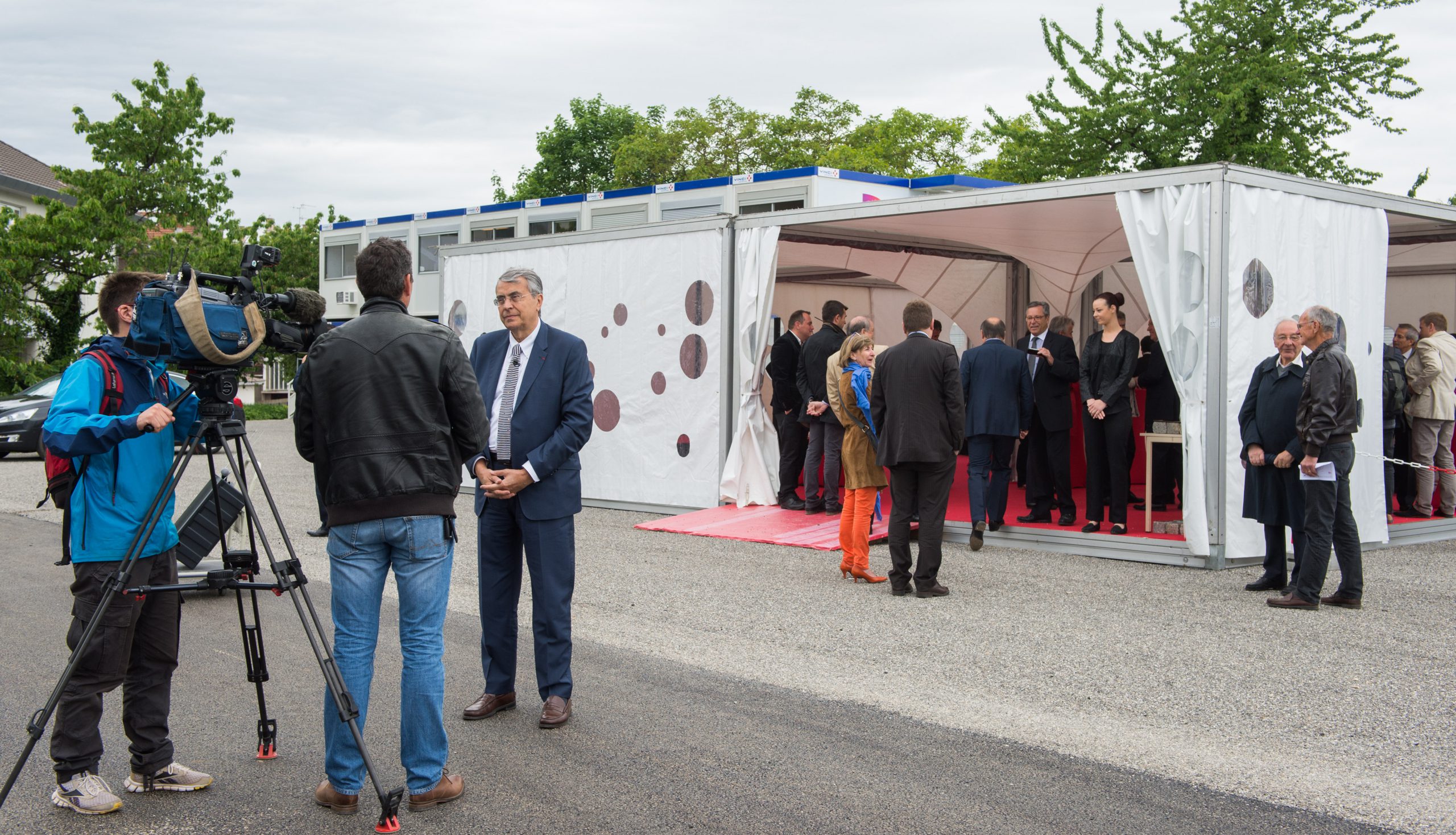 Elle a fait appel à Meetings pour accueillir au mieux les 300 invités conviés à Annemasse pour cet événement. Une prestation sur mesure : 4 tentes Cyclones, scène, moquette rouge, tables buffet, manges-debout houssés rouge… Un chantier sur les bons rails !