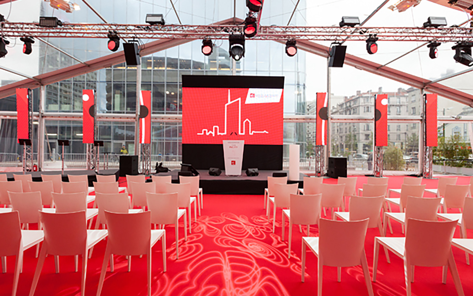 • Mobilier design : 165 chaises Squadra, banque plexi rétro-éclairé, dispositif scénique.